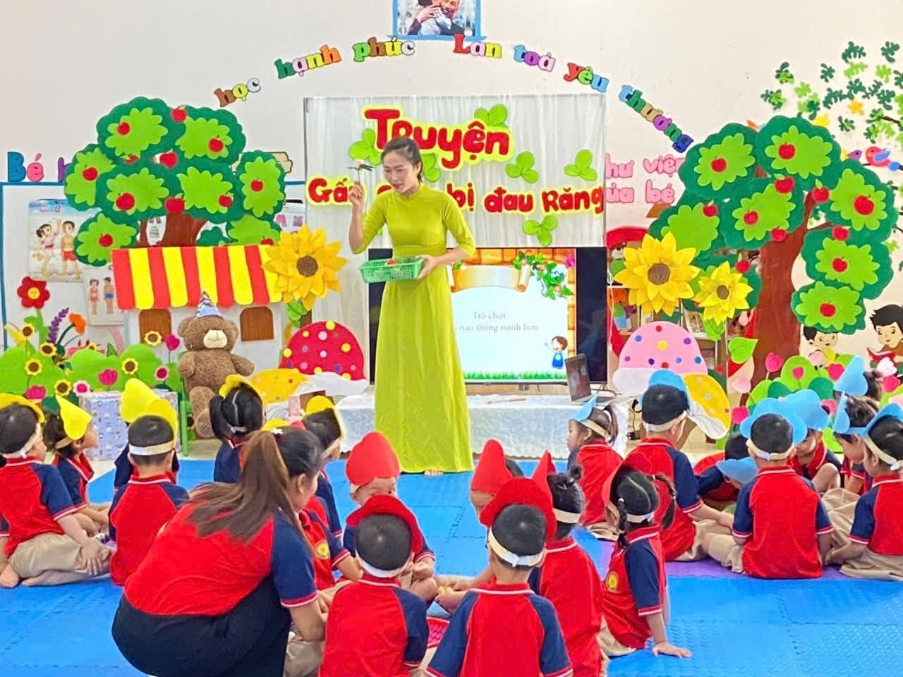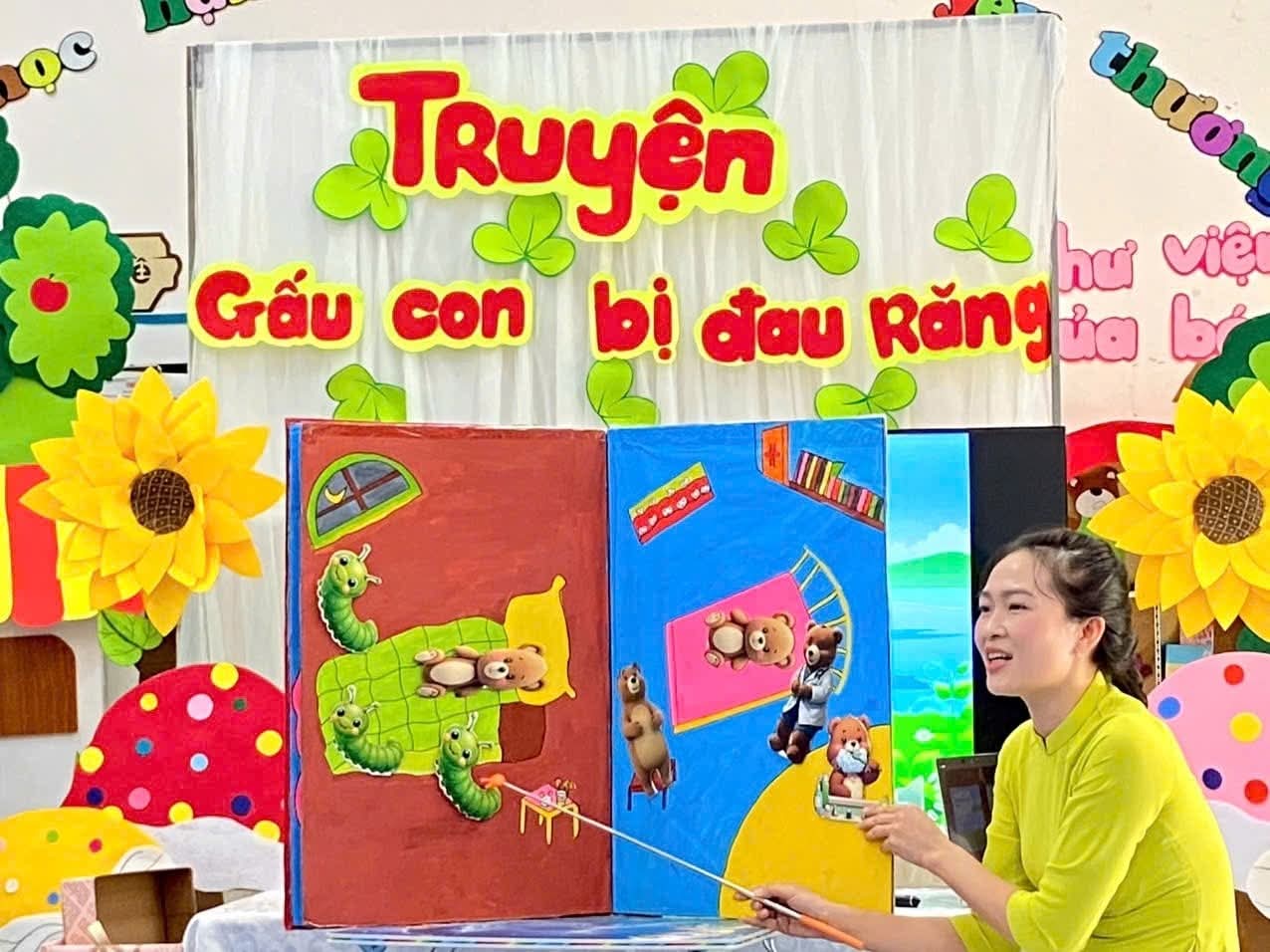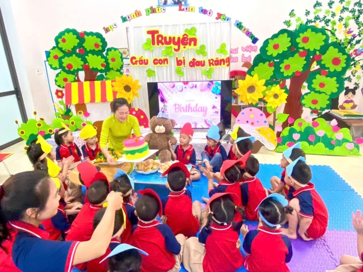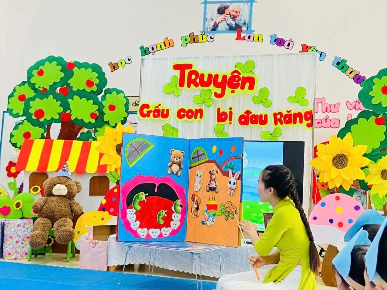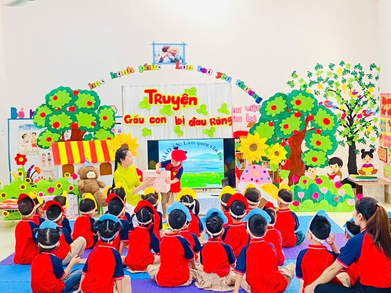 💞Trong hoạt động “Làm quen với văn học, Truyện: Gấu con bị đau răng” các con được lắng nghe câu chuyện thú vị, học cách yêu thương và chăm sóc bản thân qua bài học về giữ gìn vệ sinh răng miệng.