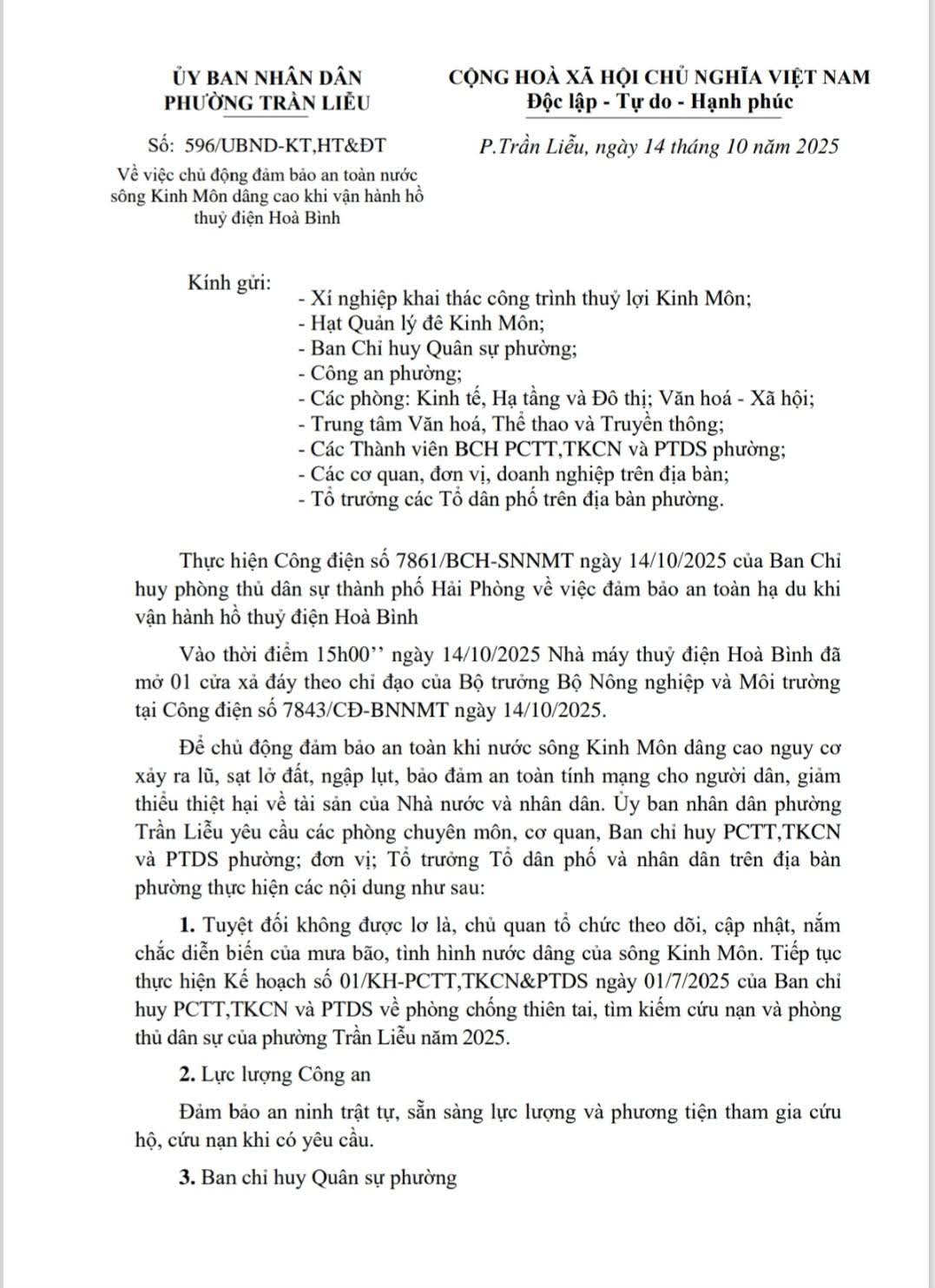 Trước thông tin Nhà máy thủy điện Hòa Bình mở một cửa xả đáy vào chiều 14/10, UBND phường Trần Liễu đã khẩn trương triển khai các biện pháp đảm bảo an toàn cho người dân và tài sản khu vực ven sông Kinh Môn.