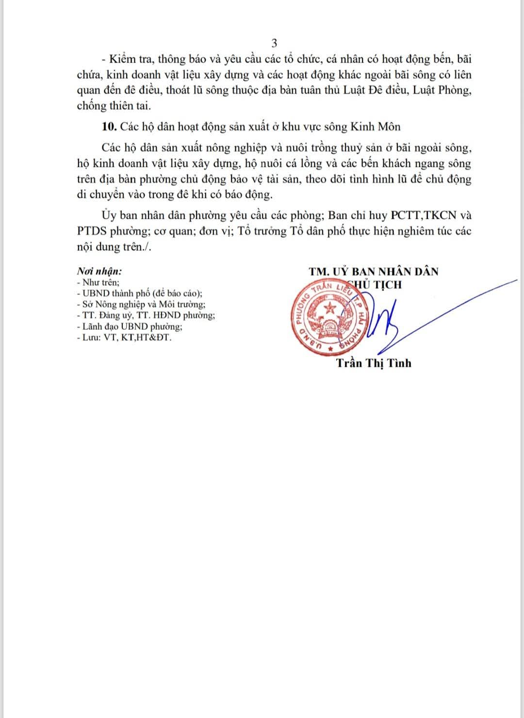 Phường yêu cầu các lực lượng chức năng, Ban chỉ huy phòng chống thiên tai, công an, dân quân và các tổ dân phố sẵn sàng ứng trực 24/24, chủ động theo dõi mực nước, rà soát điểm có nguy cơ sạt lở, ngập úng. Các hộ dân sản xuất ven sông, nuôi trồng thủy sản, kinh doanh vật liệu xây dựng được khuyến cáo chủ động di dời khi có cảnh báo.