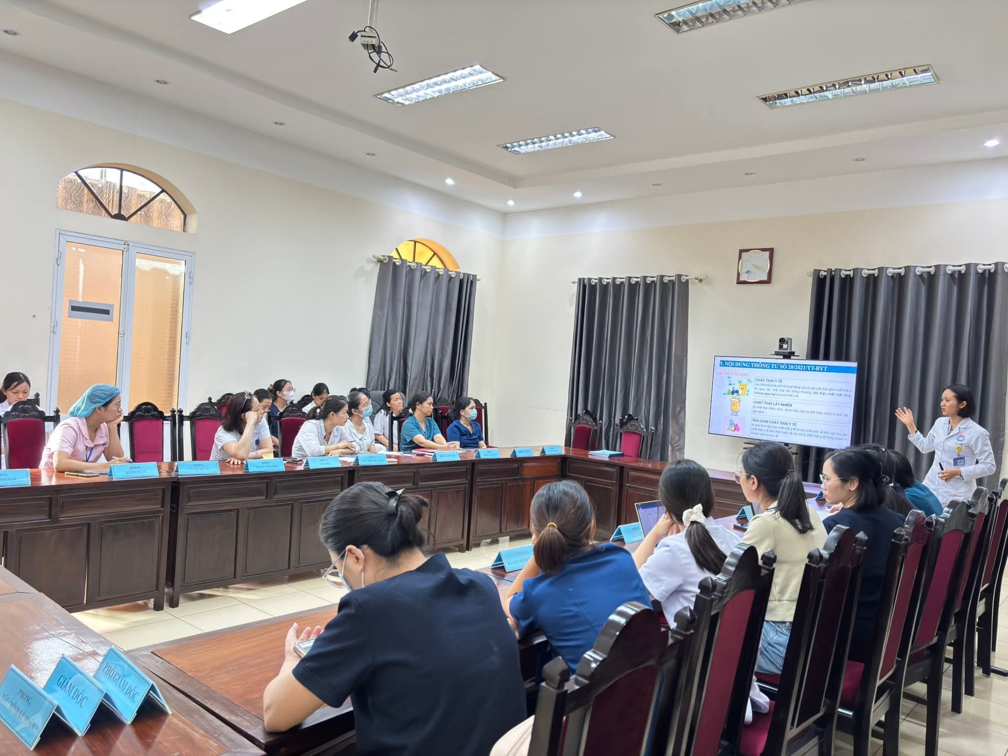 Phần thảo luận và giải đáp diễn ra sôi nổi với sự tham gia tích cực của đại diện các khoa, phòng. Nhiều vấn đề thực tế được nêu ra như: phân loại chất thải thải tại nguồn, xử lý chất thải nguy hại, ứng phó sự cố rò rỉ, rơi vãi chất thải, tràn đổ hóa chất, hay giải pháp hạn chế nhựa dùng một lần trong sinh hoạt và hoạt động chuyên môn. Qua trao đổi, các Khoa/ phòng đã chia sẻ nhiều sáng kiến và thống nhất các giải pháp phù hợp với điều kiện của Bệnh viện.