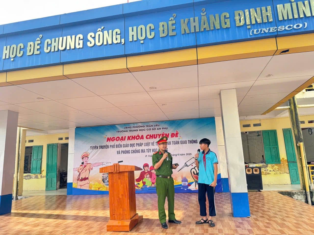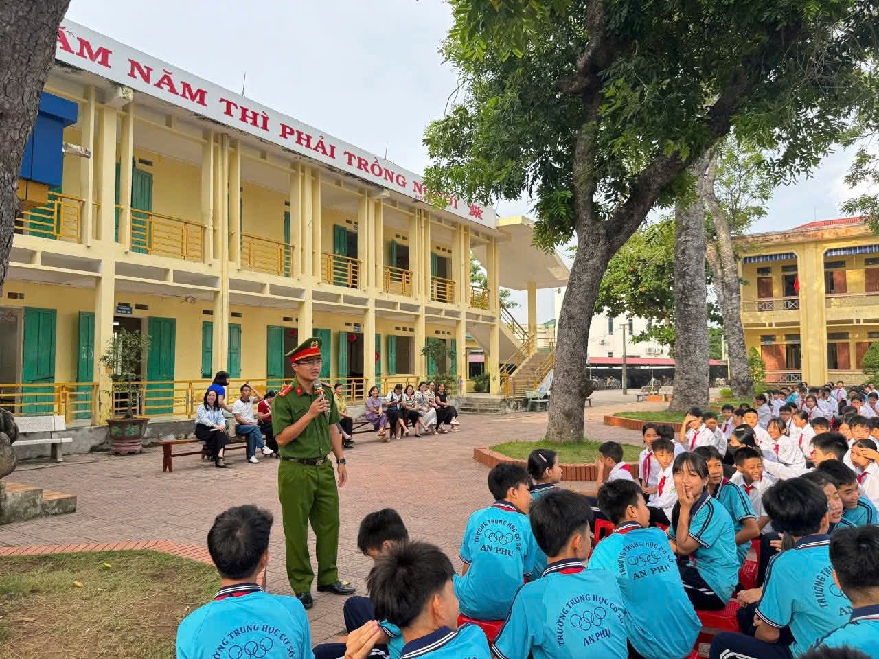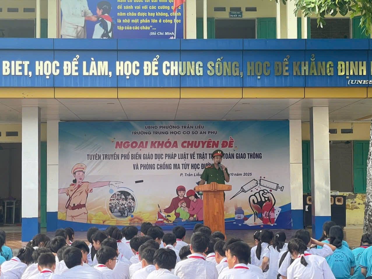 Thực hiện Kế hoạch số 01/HK-BATGT, ngày 29/8/2025 của Ban an toàn giao thông phường Trần Liễu về thực hiện “Cổng trường an toàn giao thông” trên địa bàn phường Trần Liễu; sáng ngày 11/10/2025, Công an phường Trần Liễu đã phối hợp với Trường Trung học cơ sơ An Phụ tổ chức tuyên truyền, phổ biến pháp luật về trật tự, an toàn giao thông và phòng, chống tác hại của ma túy cho 34 cán bộ, giáo viên, nhân viên cùng hơn 757 học sinh của nhà trường.