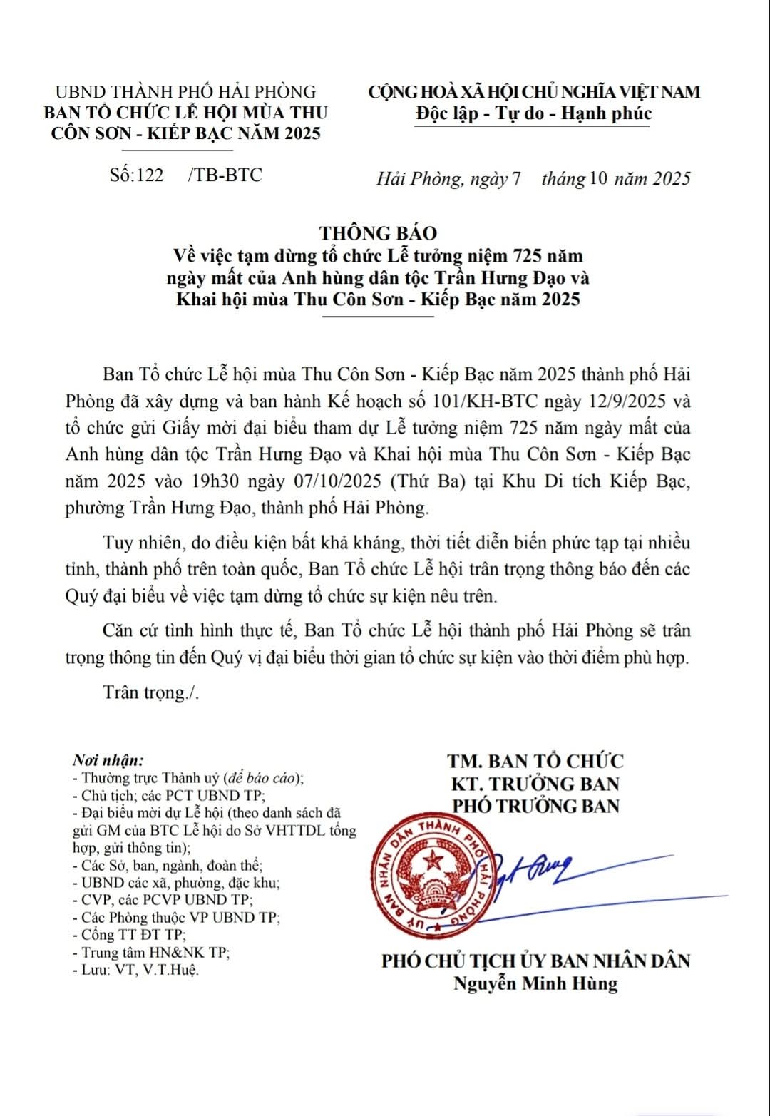📢 THÔNG BÁO TẠM DỪNG TỔ CHỨC LỄ TƯỞNG NIỆM 725 NĂM NGÀY MẤT CỦA ANH HÙNG DÂN TỘC TRẦN HƯNG ĐẠO VÀ KHAI HỘI MÙA THU CÔN SƠN - KIẾP BẠC NĂM 2025