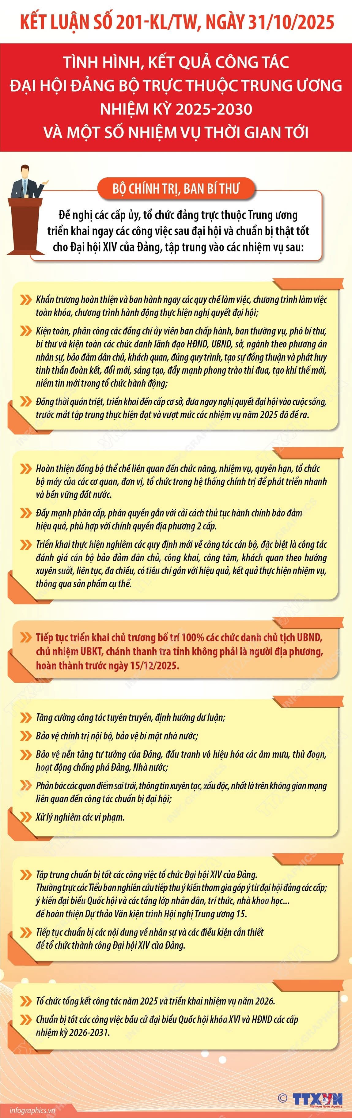 Tại Kết luận số 201-KL/TW ngày 31/10/2025 về tình hình, kết quả công tác đại hội đảng bộ trực thuộc Trung ương nhiệm kỳ 2025-2030 và một số nhiệm vụ thời gian tới, Bộ Chính trị, Ban Bí thư Đề nghị các cấp uỷ, tổ chức đảng trực thuộc Trung ương triển khai ngay các công việc sau đại hội và chuẩn bị thật tốt cho Đại hội XIV của Đảng, tập trung vào các nhiệm vụ: Khẩn trương hoàn thiện và ban hành ngay các quy chế làm việc, chương trình làm việc toàn khoá, chương trình hành động thực hiện nghị quyết đại hội; kiện toàn, phân công các đồng chí uỷ viên ban chấp hành, ban thường vụ, phó bí thư, bí thư và kiện toàn các chức danh lãnh đạo hội đồng nhân dân, uỷ ban nhân dân, sở, ngành theo phương án nhân sự, bảo đảm dân chủ, khách quan, đúng quy trình, tạo sự đồng thuận và phát huy tinh thần đoàn kết, đổi mới, sáng tạo, đẩy mạnh phong trào thi đua, tạo khí thế mới, niềm tin mới trong tổ chức hành động; đồng thời quán triệt, triển khai đến cấp cơ sở, đưa ngay nghị quyết đại hội vào cuộc sống, trước mắt tập trung thực hiện đạt và vượt mức các nhiệm vụ năm 2025 đã đề ra. Hoàn thiện đồng bộ thể chế liên quan đến chức năng, nhiệm vụ, quyền hạn, tổ chức bộ máy của các cơ quan, đơn vị, tổ chức trong hệ thống chính trị để phát triển nhanh và bền vững đất nước. Đẩy mạnh phân cấp, phân quyền gắn với cải cách thủ tục hành chính bảo đảm hiệu quả, phù hợp với chính quyền địa phương 2 cấp. Triển khai thực hiện nghiêm các quy định mới về công tác cán bộ, đặc biệt là công tác đánh giá cán bộ bảo đảm dân chủ, công khai, công tâm, khách quan theo hướng xuyên suốt, liên tục, đa chiều, có tiêu chí gắn với hiệu quả, kết quả thực hiện nhiệm vụ, thông qua sản phẩm cụ thể. Tiếp tục triển khai chủ trương bố trí 100% các chức danh chủ tịch uỷ ban nhân dân, chủ nhiệm uỷ ban kiểm tra, chánh thanh tra tỉnh không phải là người địa phương, hoàn thành trước ngày 15/12/2025…