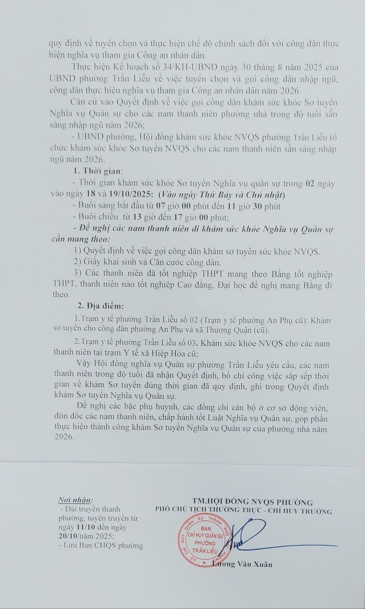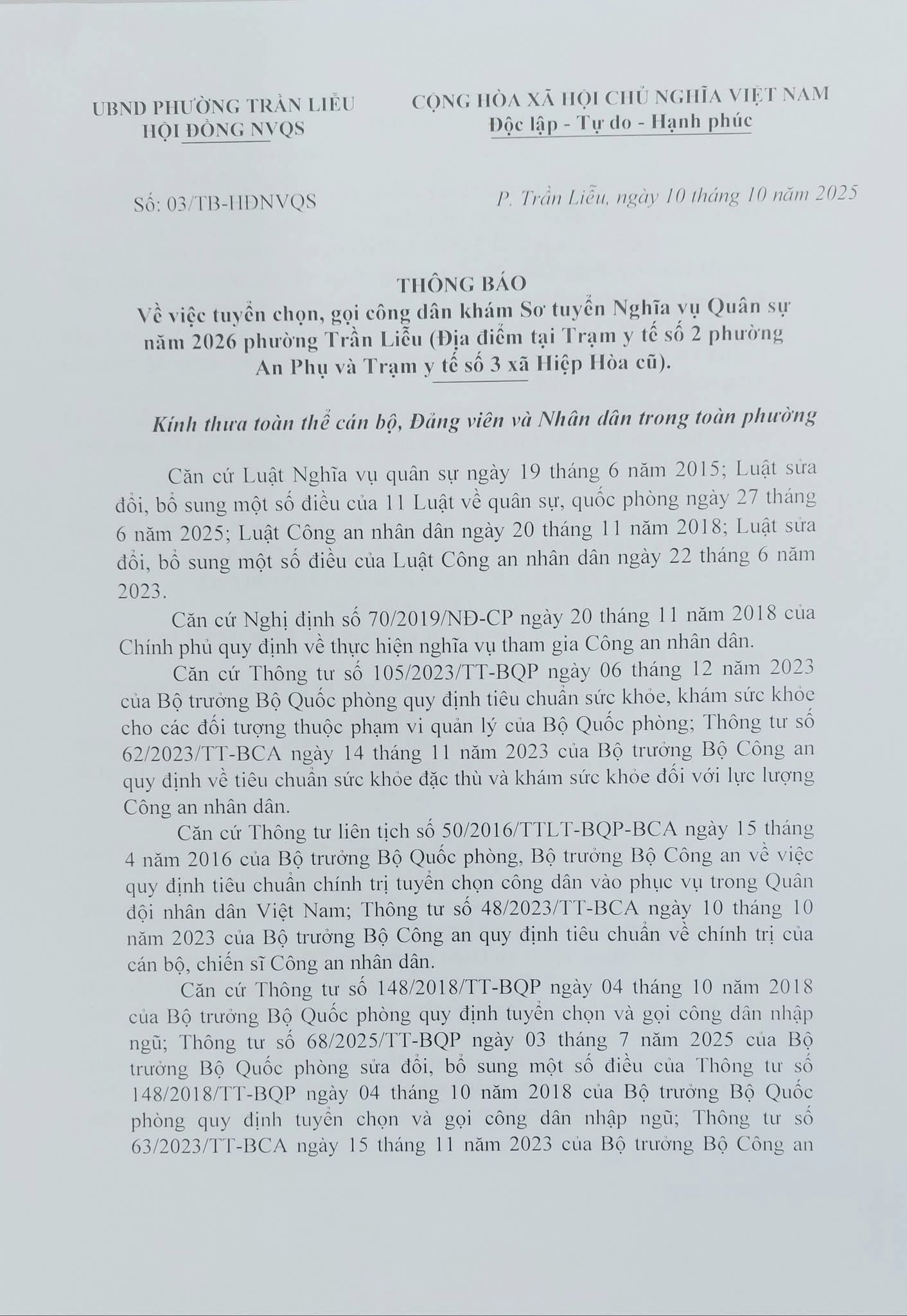 Thực hiện Luật Nghĩa vụ quân sự và Kế hoạch số 34/KH-UBND ngày 30/8/2025 của UBND phường Trần Liễu về việc tuyển chọn, gọi công dân nhập ngũ và tham gia Công an nhân dân năm 2026, Hội đồng Nghĩa vụ quân sự phường Trần Liễu thông báo tổ chức khám sơ tuyển sức khỏe Nghĩa vụ quân sự cho nam thanh niên trong độ tuổi sẵn sàng nhập ngũ năm 2026.