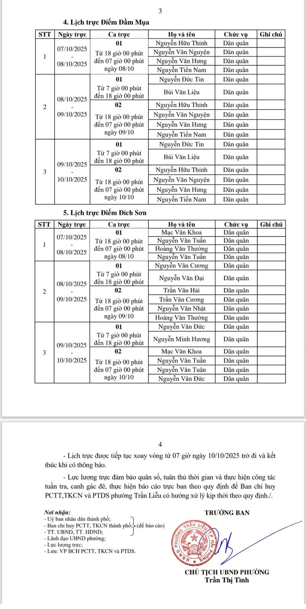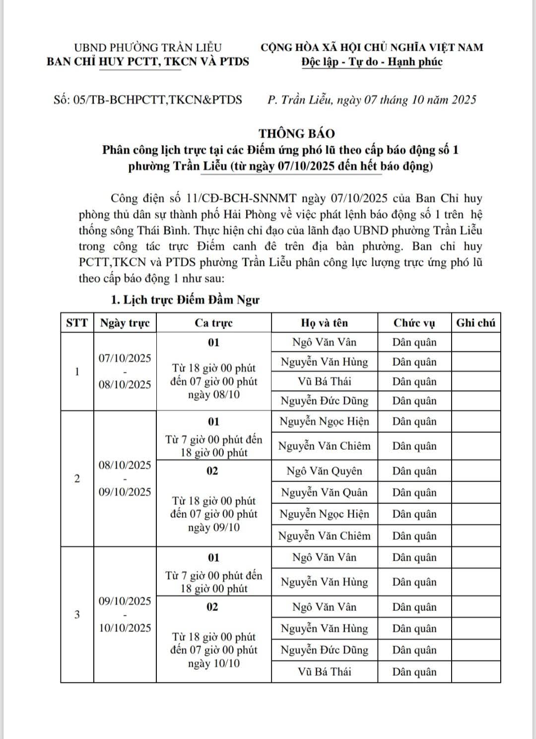 PHƯỜNG TRẦN LIỄU THÔNG BÁO PHÂN CÔNG LỊCH TRỰC TẠI CÁC ĐIẾM ỨNG PHÓ LŨ THEO CẤP BÁO ĐỘNG SỐ I